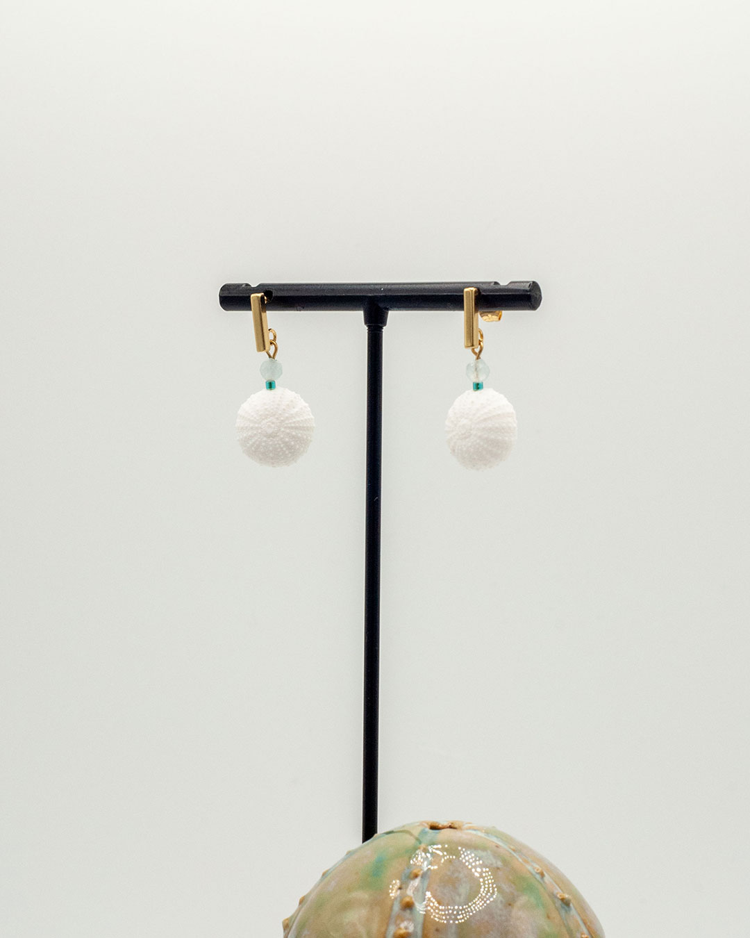 Montées sur des apprêts en acier inoxydable doré à l’or fin, ces boucles d’oreilles offrent un contraste subtil entre la blancheur de l’oursin et les nuances aquatiques de l’aigue-marine.